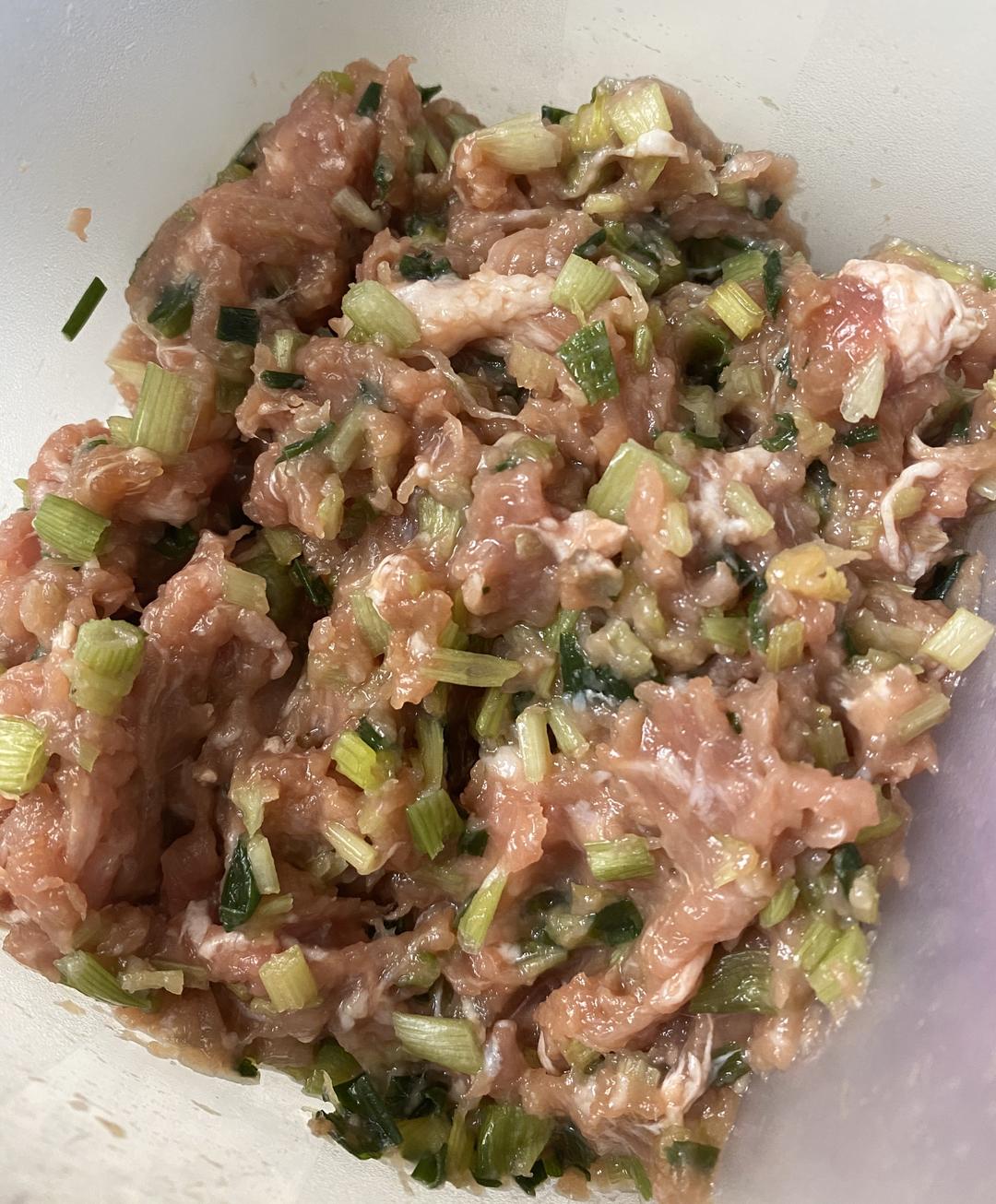 猪肉剁成肉糜,这样更容易熟。肉糜加入葱、芹菜、生抽、少许糖(提鲜)、油腌制一会。
