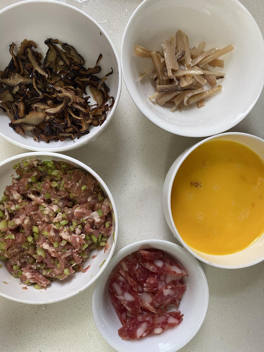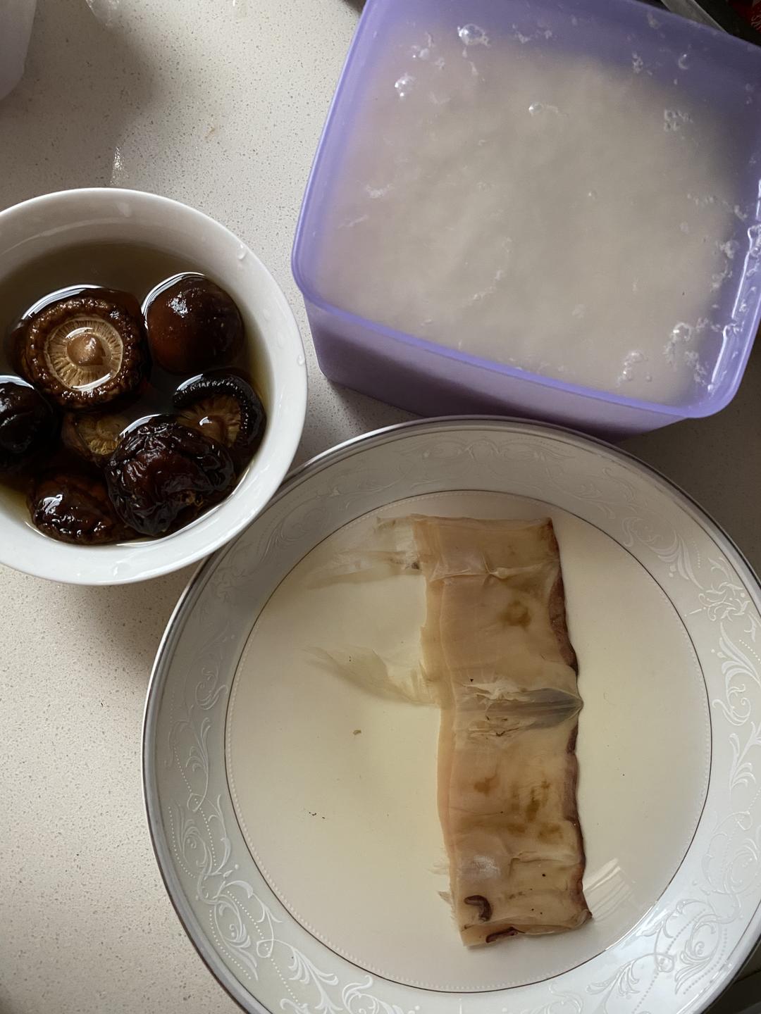 提前一夜把泡大米,以便第二天制作米浆。香菇、干鱿鱼也需提前泡软。