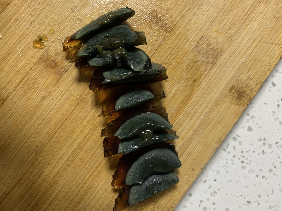 切瓣儿、陈醋倒入小碗中,把皮蛋放入陈醋碗中,把皮蛋的冲鼻味去一下