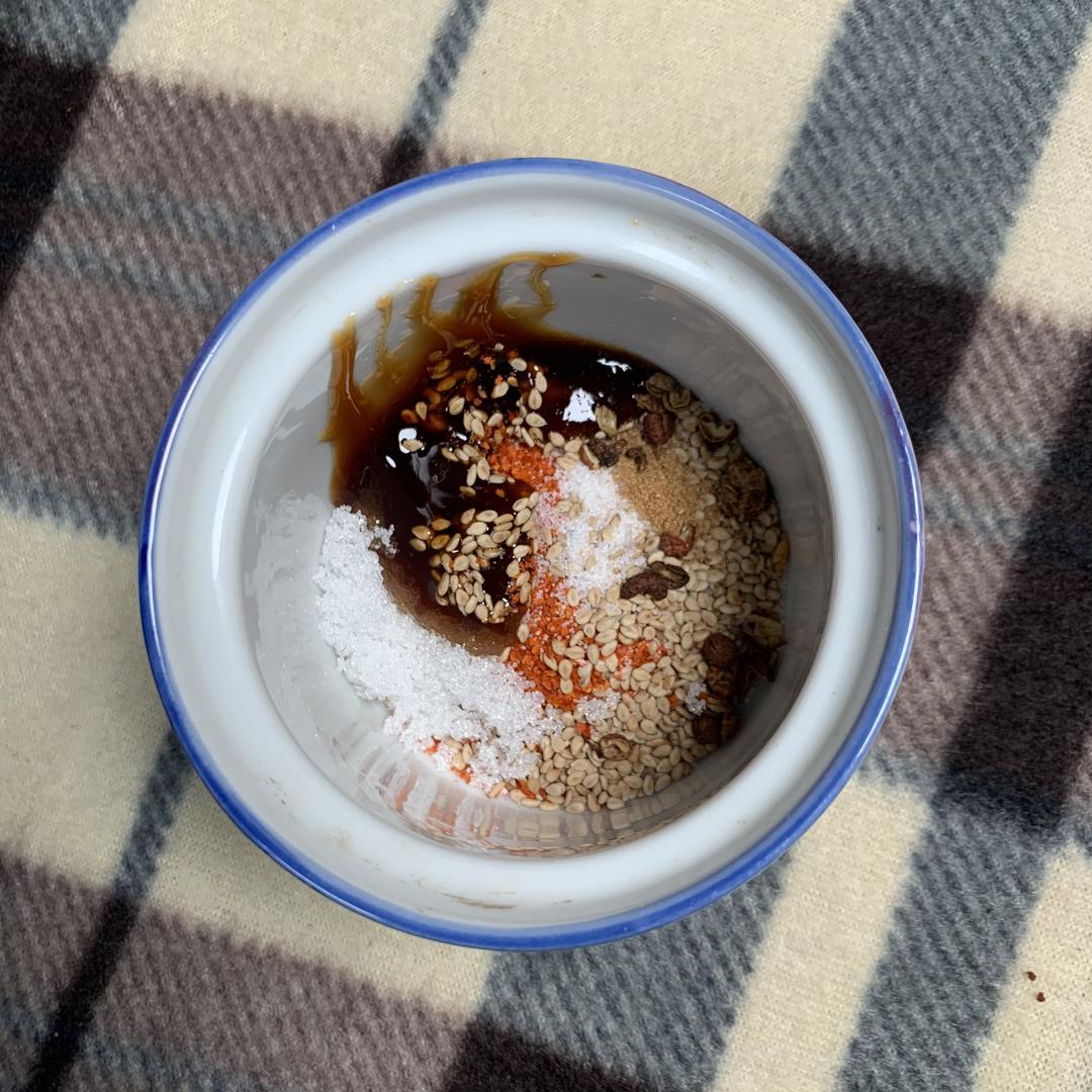 如果想吃辣口的,辣椒面、芝麻、一点点盐、蚝油,喜欢麻味的,加一点点麻椒。刚才炒花生剩下的油再烧热倒入