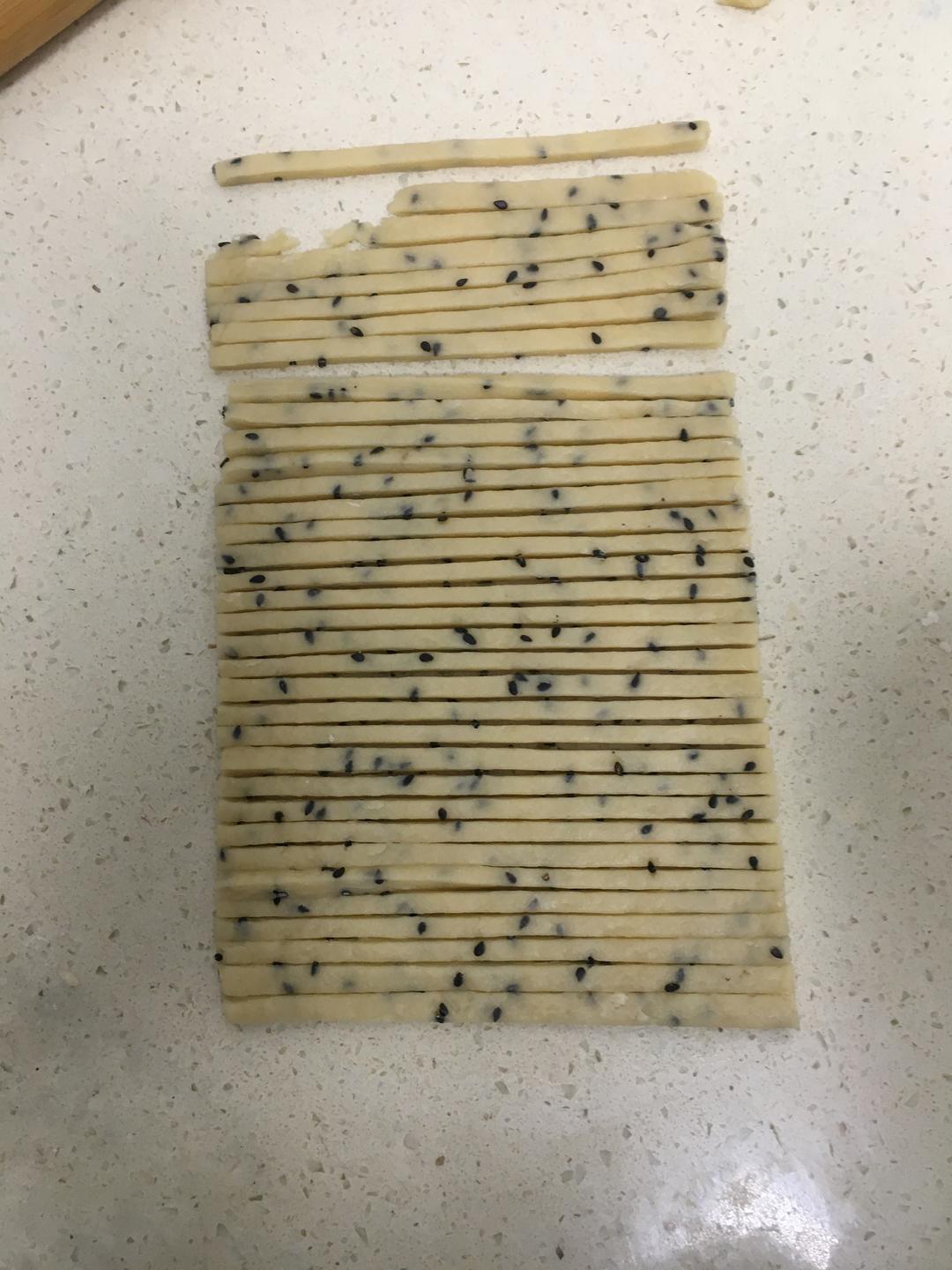 切一小份面团擀成2-3毫米左右的薄片,切去边角,横切成3毫米左右的条。