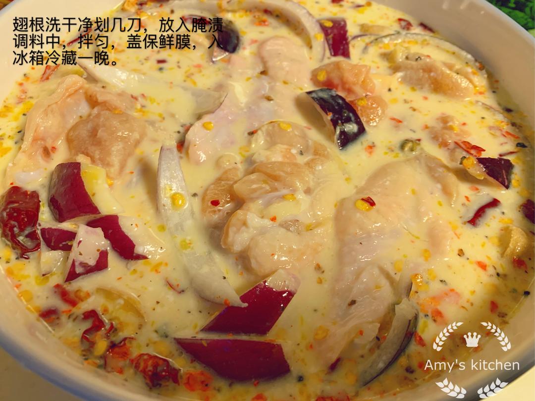 第一步,调腌渍翅根的调料。350ml牛奶,一个柠檬的柠檬汁,搅拌,形成白脱牛奶。半个洋葱切切,几片姜,一勺子蒜末,一勺子辣椒粉,一勺子黑胡椒,我还放了点辣椒碎,搅拌。再打入两个鸡蛋搅拌。