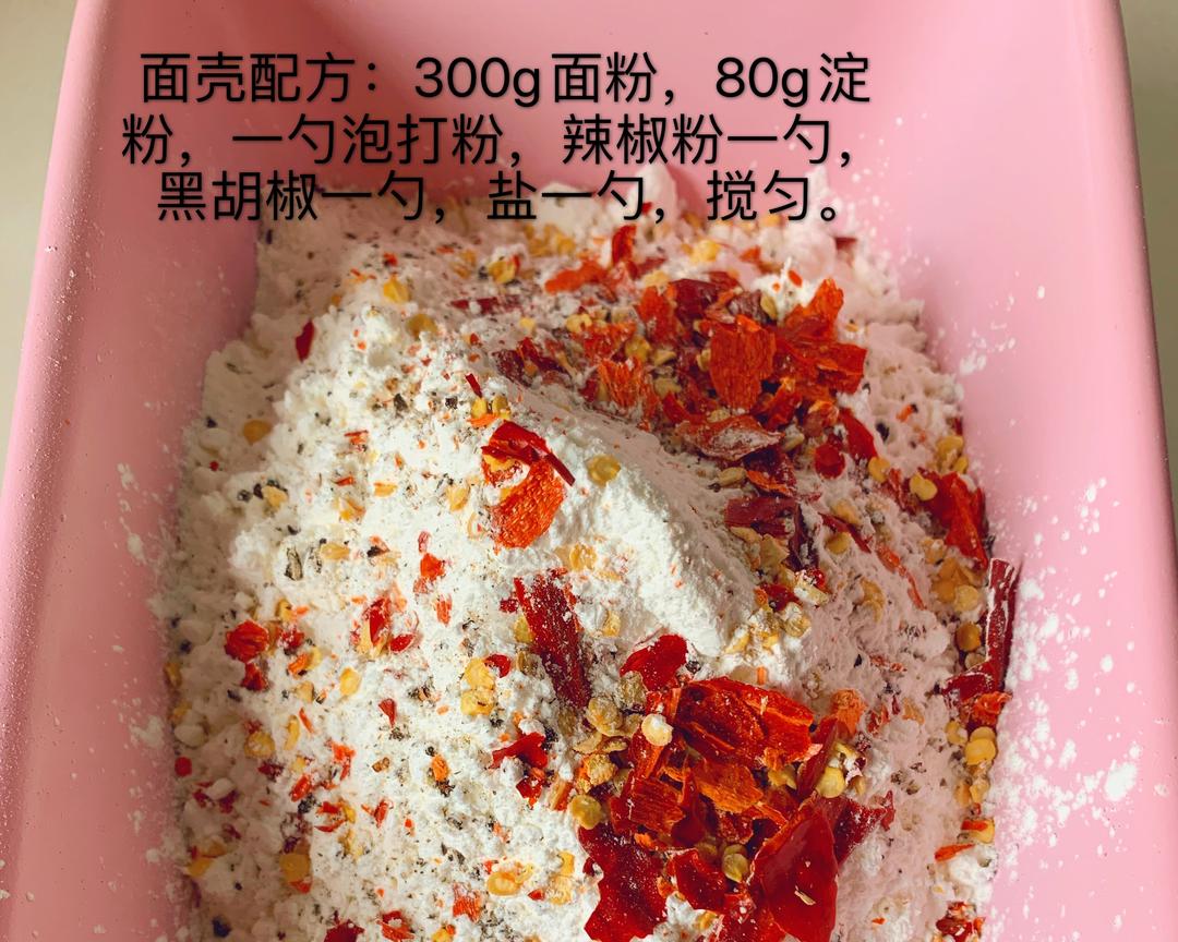 第二天拿出腌入味的翅根,开始配面壳。300g面粉,80g淀粉,一勺泡打粉约5g,辣椒粉一勺,黑胡椒一勺,盐一勺,搅匀。