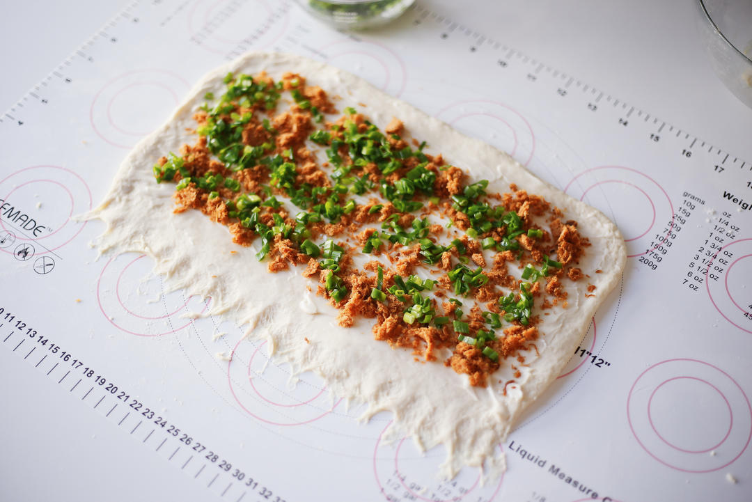 将面团擀成一个宽20cm*长30cm的长方形,底边要薄一些,可以用手指捻开便于卷起时粘住不散,刷一层沙拉酱(底部边缘不要刷),均匀的撒上香葱碎和肉松;