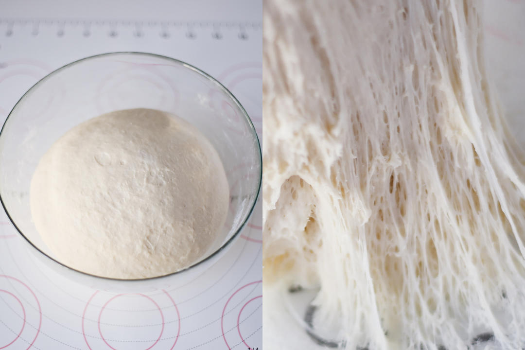 第二天拿出来,面团已经明显发酵2倍大,通过长时间静置已经自己产生筋度了,发酵好的面团内部是蜂窝状的;