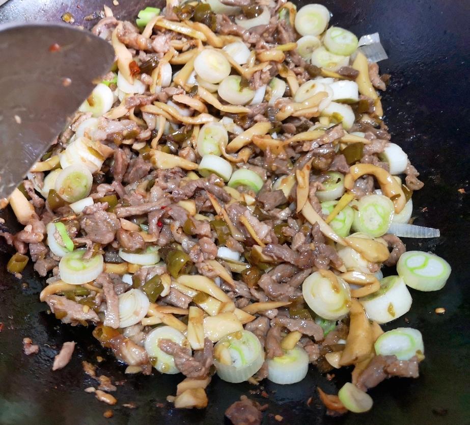倒入大葱翻炒10秒,起锅前加入少量起锅醋。