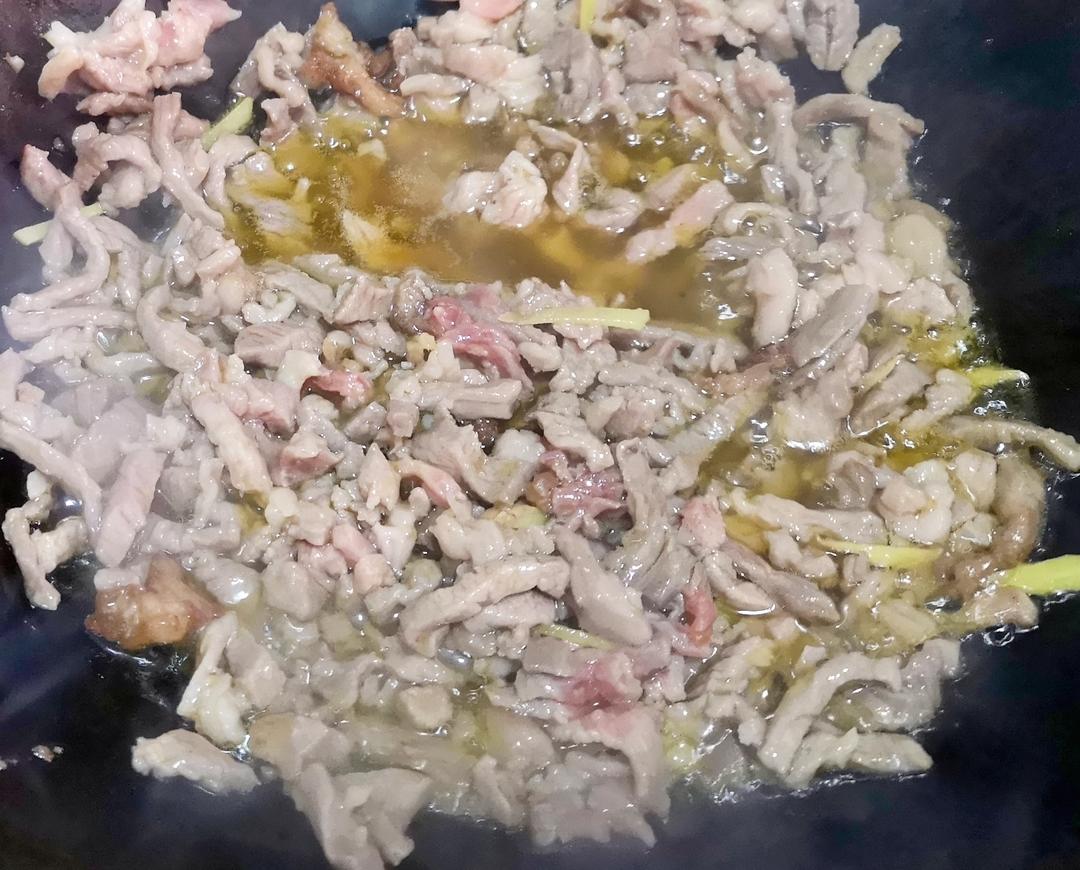 锅烧热倒油,油烧热倒入肉丝炒散,肉丝炒至五六成熟,起锅备用。