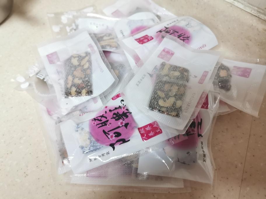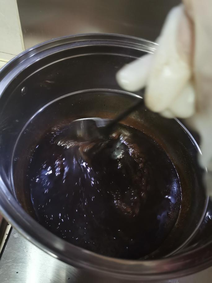 如图,先开大火并倒入捣碎好的冰糖(冰糖太大之后不容易化开,而阿胶熬制过程需要随时搅拌且时间很短,为避免慌乱先把冰糖打碎),等阿胶沸腾气泡后,黄酒的酒精就基本挥发了,这时候立即关中小火开始不停顺时针打圈搅拌。 阿胶很贵糊锅的话太浪费了,所以要随时搅拌注意火候。 这里忘记拍照了,搅拌到什么程度才算好了?就是你把铲子提起来,阿胶可以从铲子上滴下来但是能形成一面三角旗倒挂。这时候就把火关到很小,立即加入核桃红枣枸杞,然后立即搅拌均匀,记得要立即搅拌,不然等阿胶凝固了就很伤肌肉了,这个时候先不加入芝麻,芝麻非常非常非常难搅拌,所以先把其他的拌匀了再加入芝麻。 芝麻记住也要分两次加入,实践证明没有相当的臂力不要轻易尝试,或者可以求助家里的男士…… 反正总之阿胶很贵千万别糊锅浪费啊!