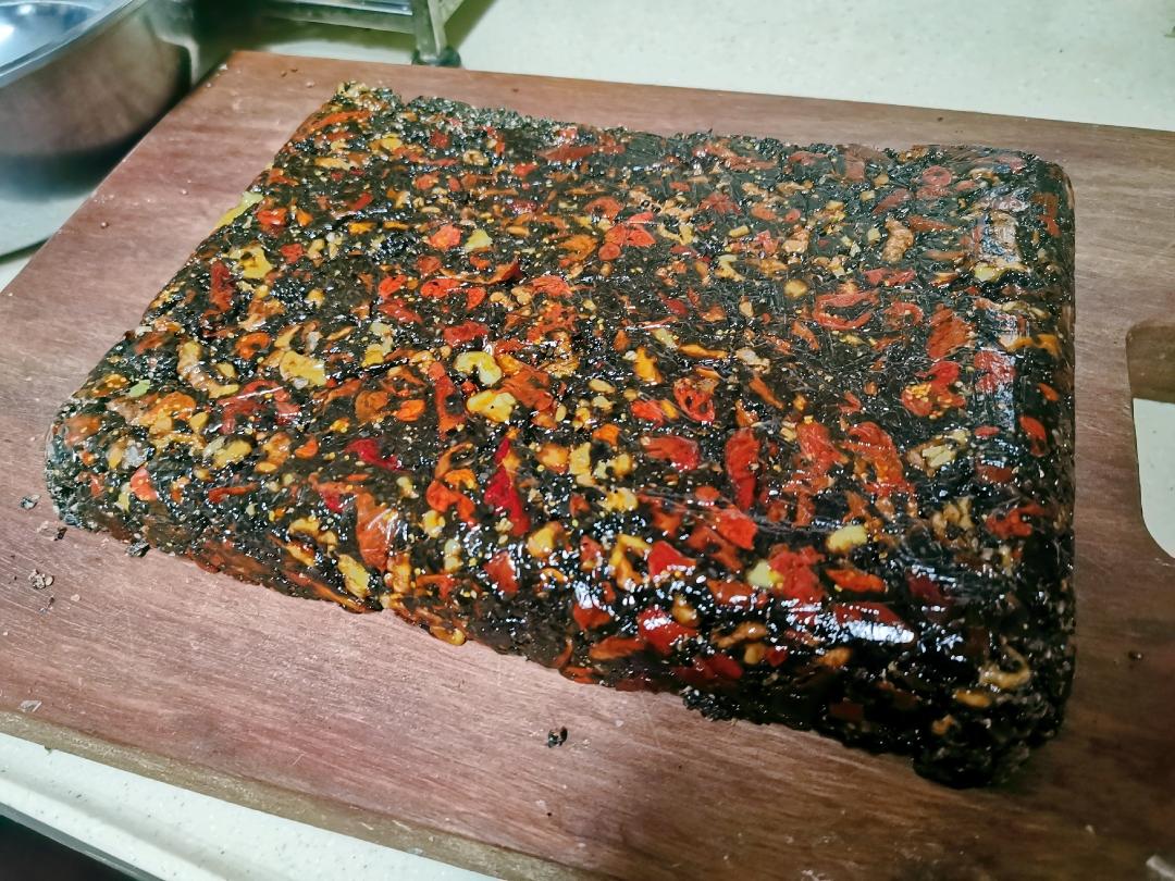 最后拌好的固体倒入事先摸好油放好保鲜膜的盘子里,用手或者擀面杖拼命压实。 我压的时候出了一头汗("▔㉨▔) 然后放在比较低温的地方(我放在凉台上)等着凝固。可以在上面再铺一层保鲜膜之后压上重物帮助整形。