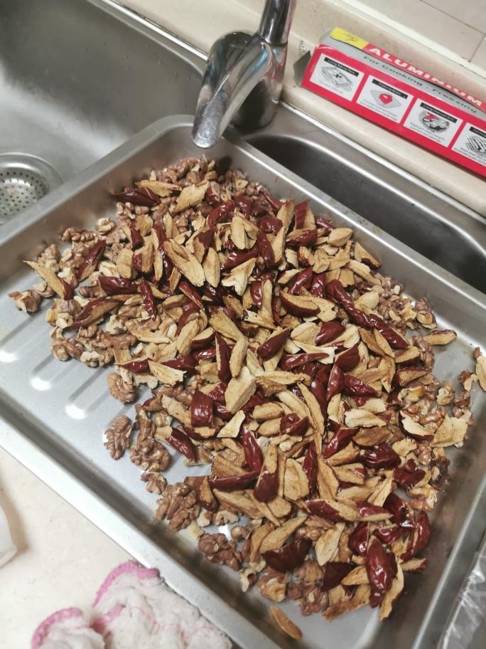 等阿胶浸泡48小时后,就可以制作了。先准备其他的材料。把红枣和核桃都剪成小块,便于之后搅拌。然后放烤箱烤制一会,不用烤的太厉害只要出香味即可,烤完后留在烤箱内保温。 枸杞我买的免洗的,如果有灰尘要提前洗好晾干。 枸杞和芝麻一旁备用。