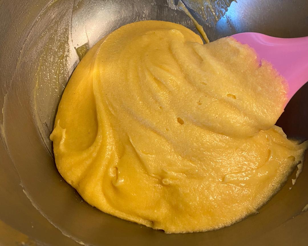 材料(B)一次性全部加入材料(A)中,用打蛋器慢慢搅拌至没有干粉,再加入柠檬汁搅拌均匀。不要狂搅,轻柔一点,干粉差不多消失就停止。