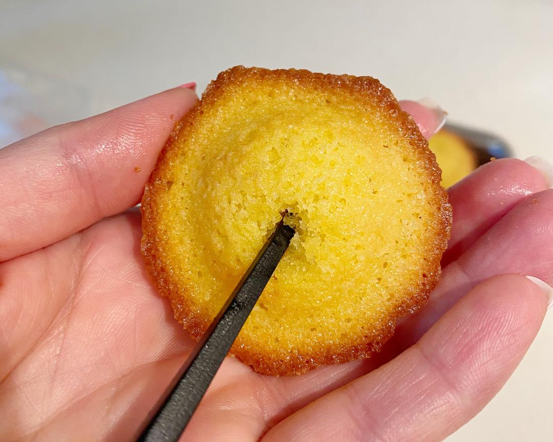 乘玛德琳温热的时候用筷子尖在膨胀的肚脐上插一个小洞,轻轻的转一圈,让里面空间大一点可以多挤点酱。