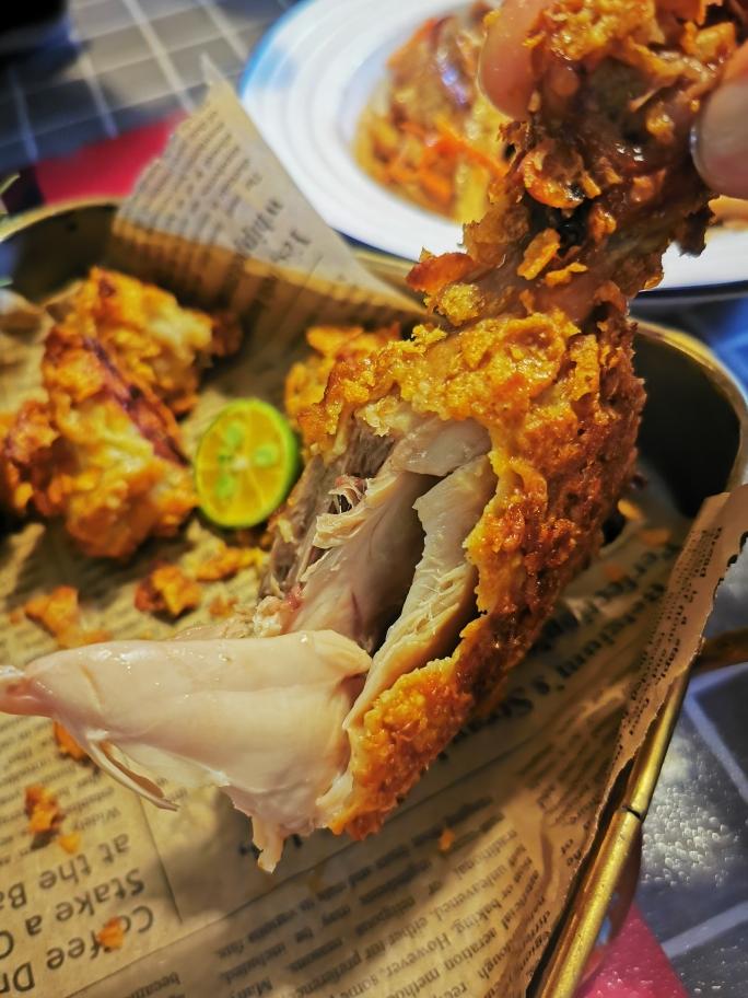 鸡腿划几刀,所有调料抓匀,牛奶倒入淹没一半,牛奶太贵了舍不得淹完,中途翻面一下就行。冷藏腌渍一晚。