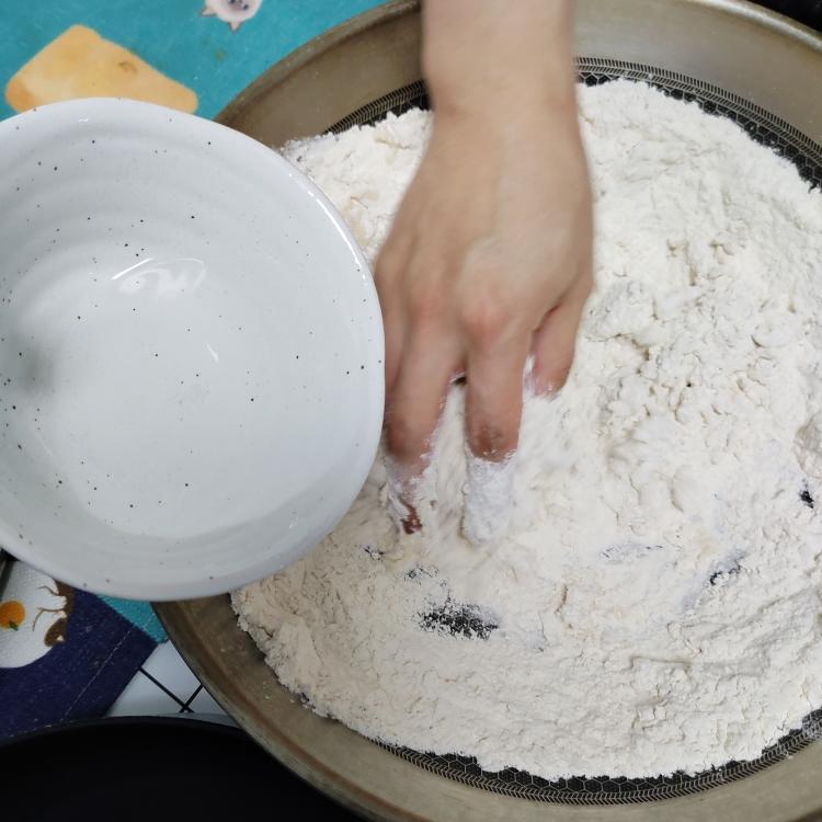 温水+盐混合,不断加入面粉里