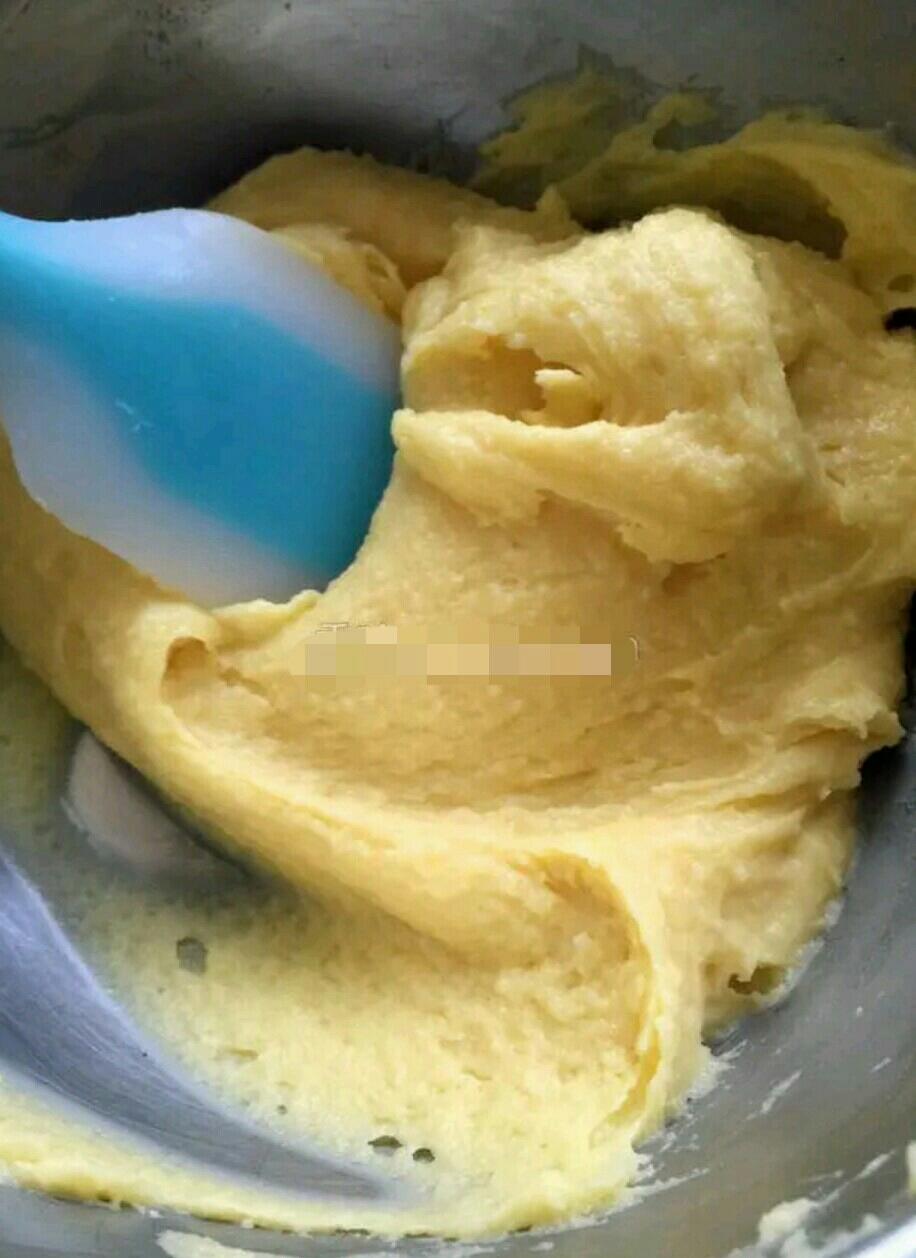 倒入低筋面粉后搅拌至无颗粒状态