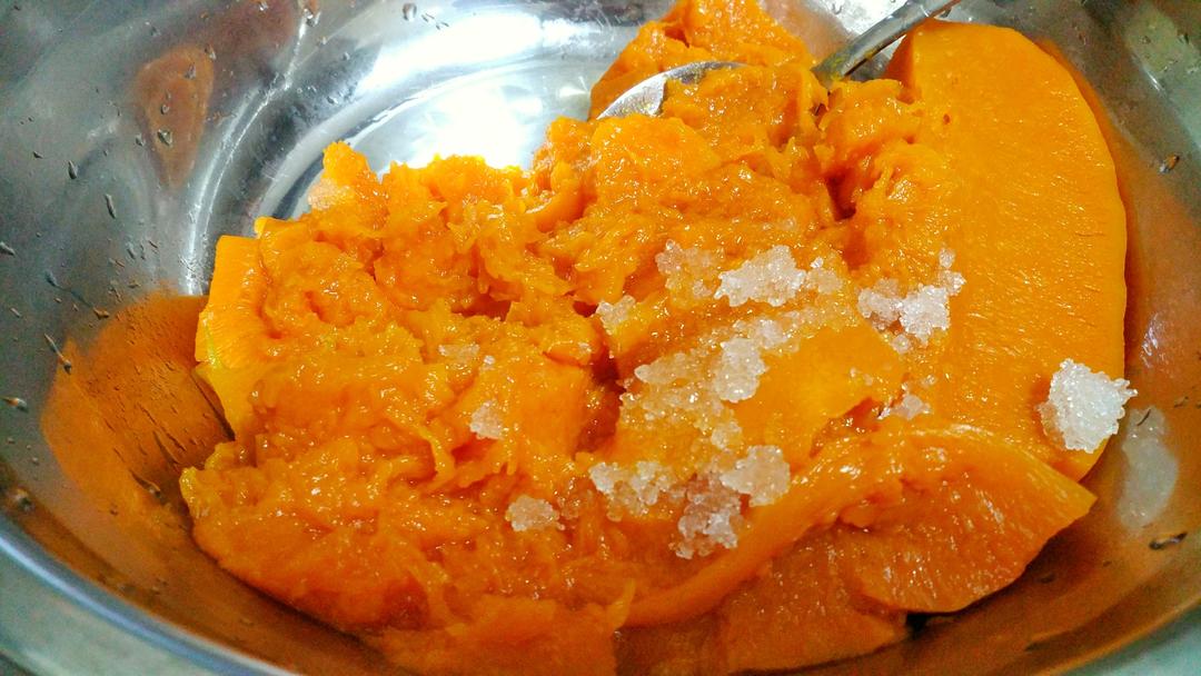 南瓜上锅蒸熟,倒入白砂糖,搅成泥;
