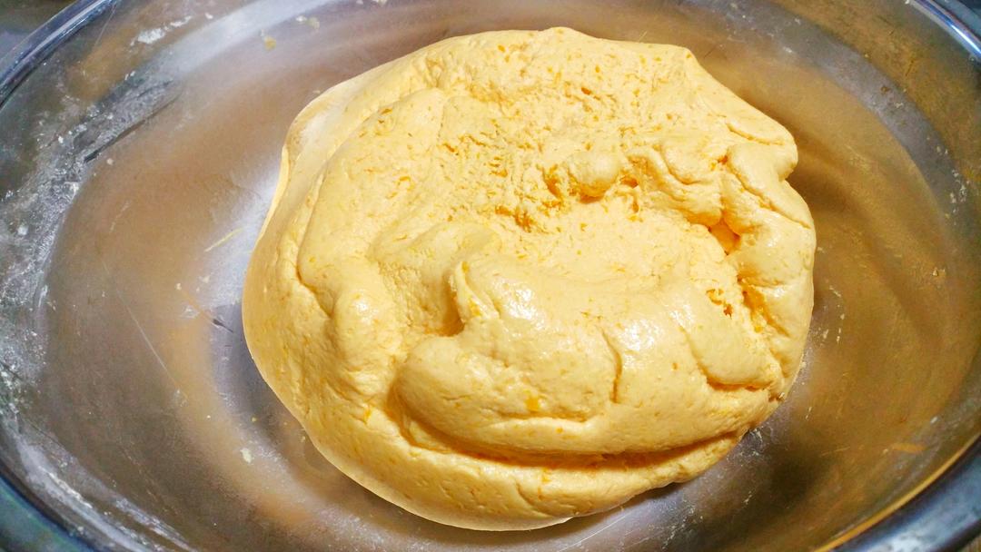 将和好的糯米粉和南瓜泥揉成团;