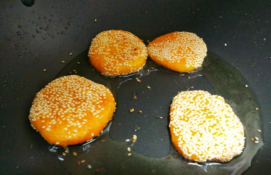 油锅倒盖住锅底的油量,油温七成热,将火调到最小,放入裹了芝麻的南瓜饼,开始小火慢煎;