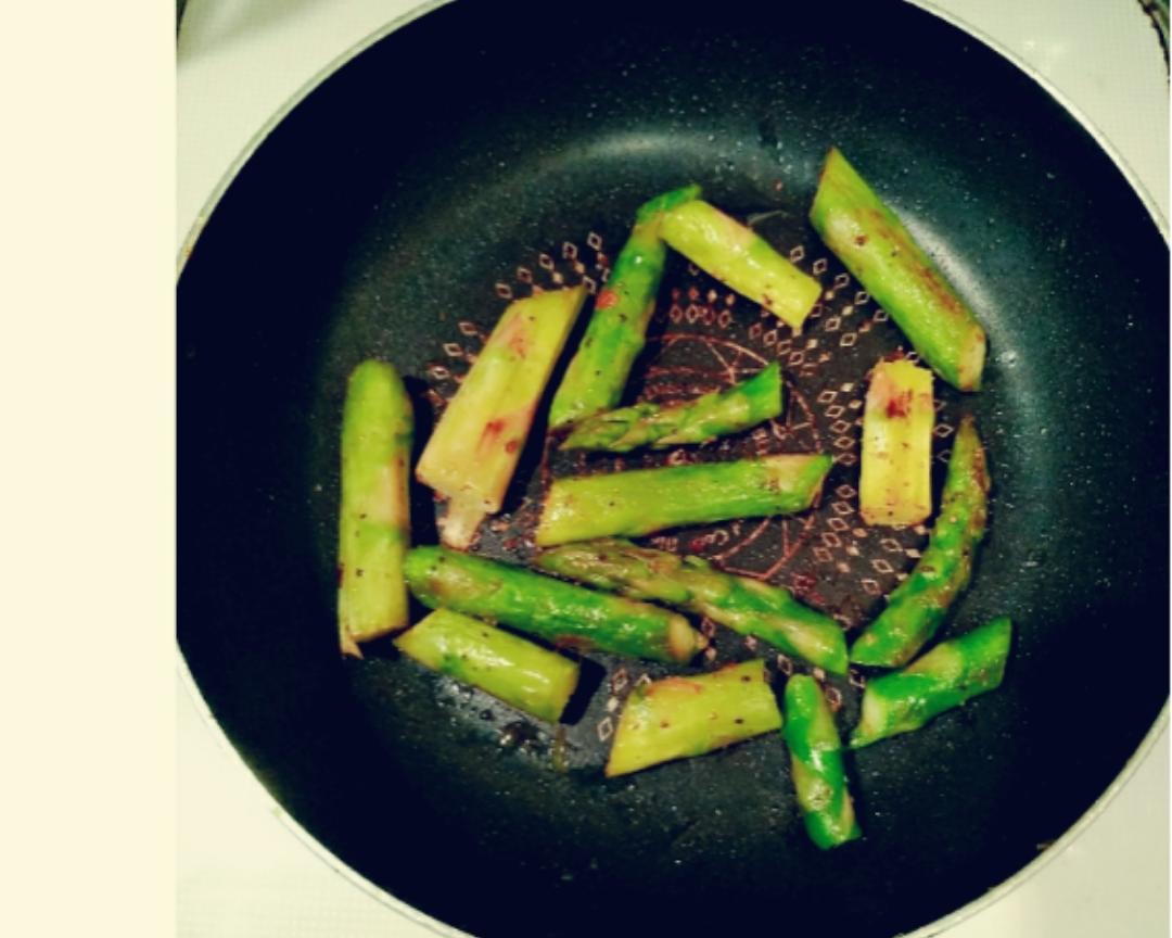 ⭐【脆煎芦笋】 1.芦笋清洗,去老根,切段; 2.下油锅煎3-5分钟,不需要太久; 3.加入适量调味品调味: 盐,胡椒等; 4.盛出,摆盘。