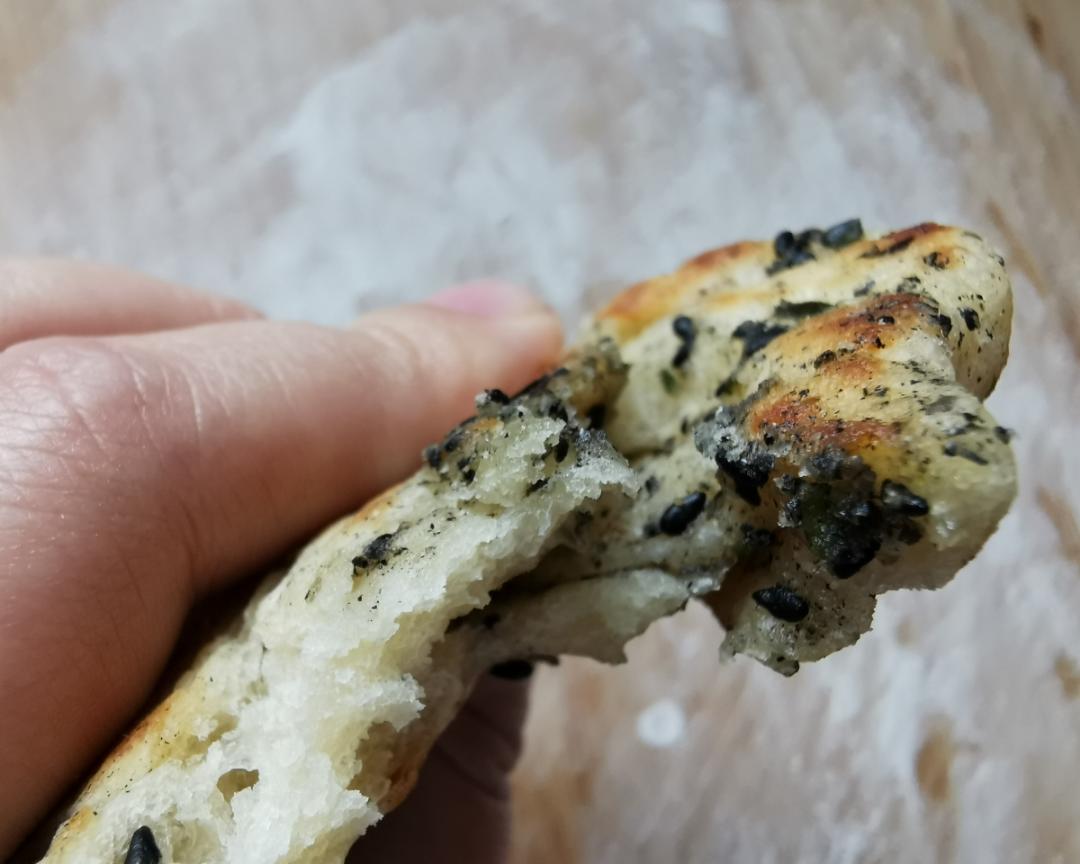热锅下稻米油,起温度以后放入大蒜叶子碎,稍微炸炸,别炸糊了。加面粉和黑芝麻碎调和油酥,略稀即可。油酥不用纠结如果你家连大蒜叶子都没有,替换成超洗胡萝卜丝,条件好加点肉末都可以。