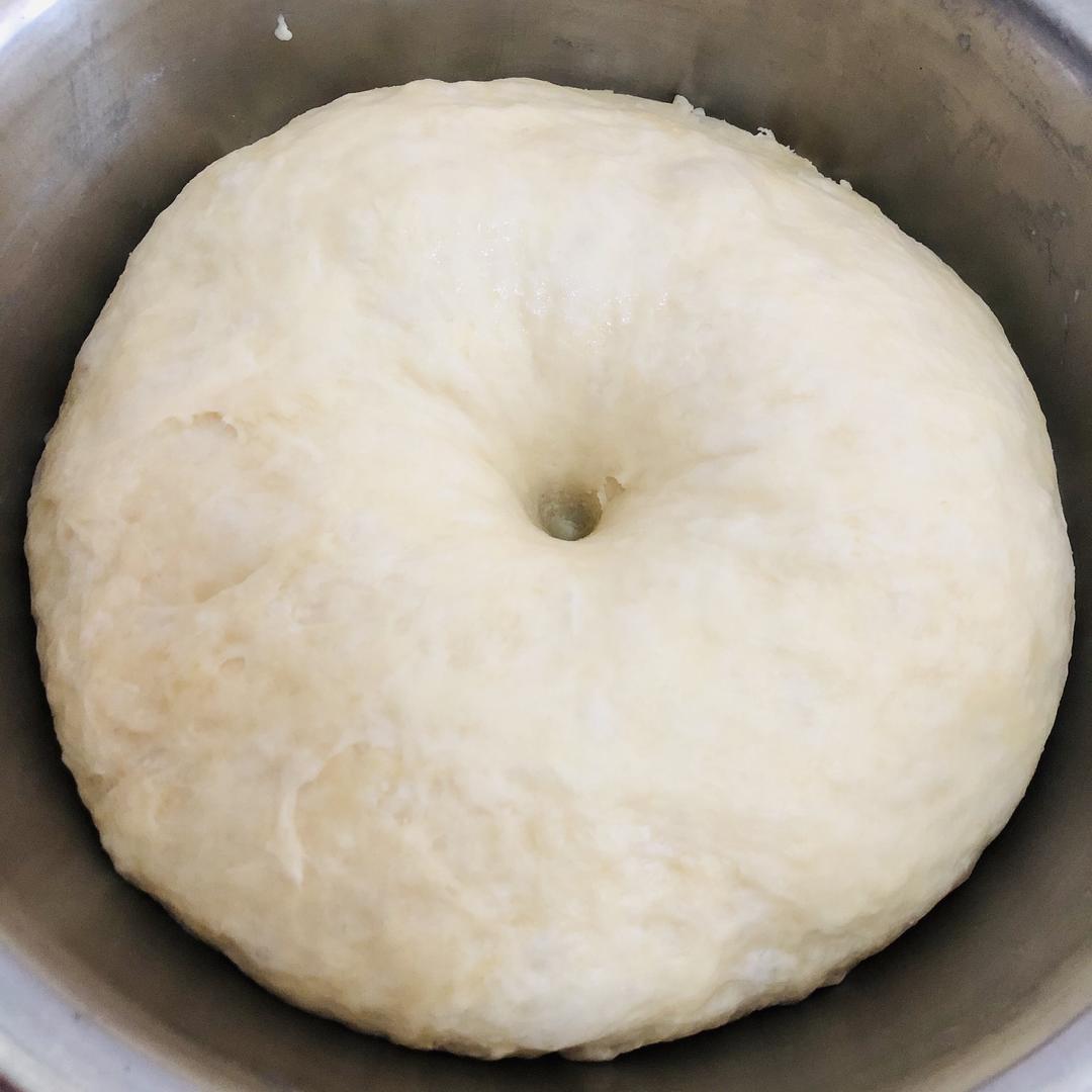 发酵方法: 1️⃣放冰箱保鲜层发酵12h左右,我一般是晚上揉好面团放冰箱发酵一晚,早上起来做(放冰箱恒温空间里,冰箱冷藏温度太低不容易发) 2️⃣35°C左右发酵,烤箱没有低温选择的话可以到一烤盘热水放烤箱下层,面团放烤箱上层发酵,醒发45分钟左右,面团大约是原来的两倍大。时间到后取出,放在面板上用擀面杖擀开排气,再揉圆。