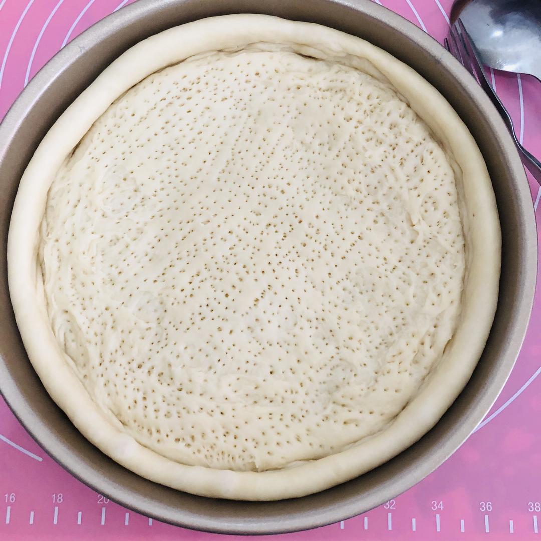 将面团擀圆,放入烤盘,用勺子压出边缘,我比较爱吃披萨饼的边,就把面团都擀到烤盘外壁啦,中间薄四周厚。然后用叉子戳眼,一定要扎透,然后将饼坯放烤箱中层上下火200°C烤5分钟