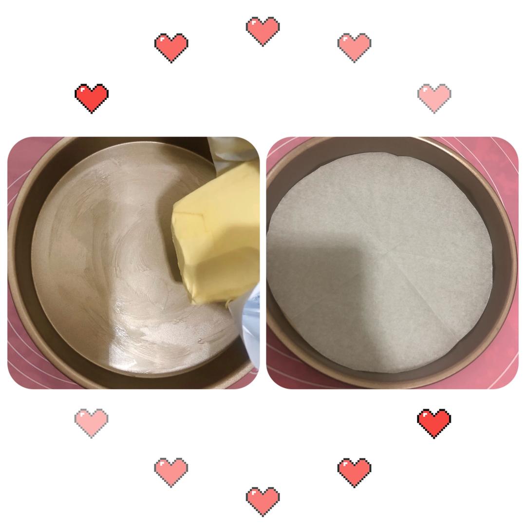 烤盘(6寸)涂上黄油,或者垫上一层硅油纸,懒癌星人选择后者省的刷盘哈。