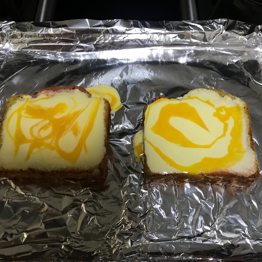 把步骤1的蛋奶液小心翼翼的倒在步骤2按压好的吐司里,然后把准备好的1个蛋黄打散,用大师级的手法倒在蛋奶液上
