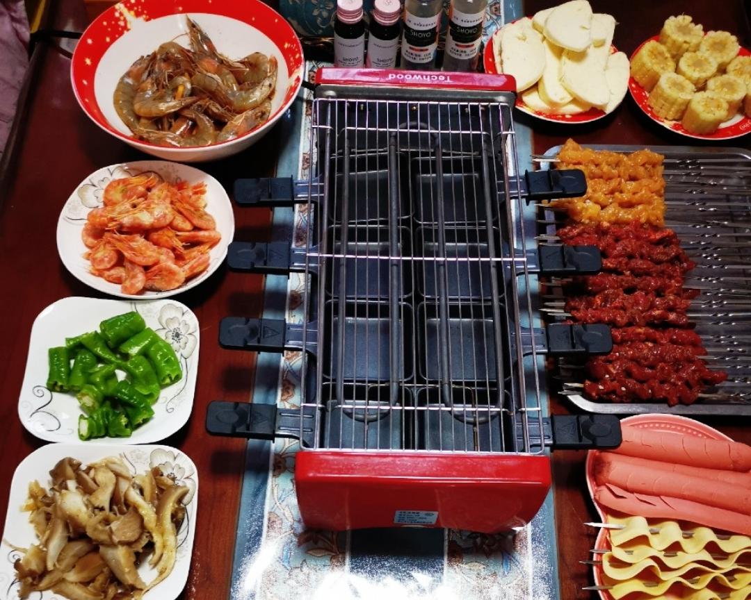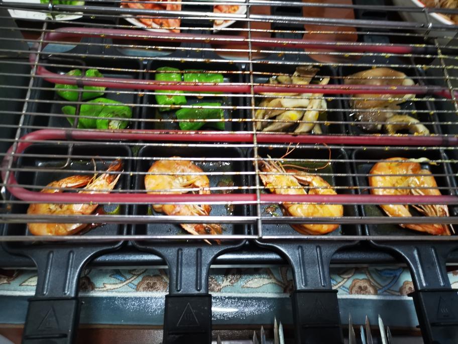 下层烤虾,虾烤好直接可以吃,不用放调料,特别香,鲜蘑,辣椒,都刷酱料