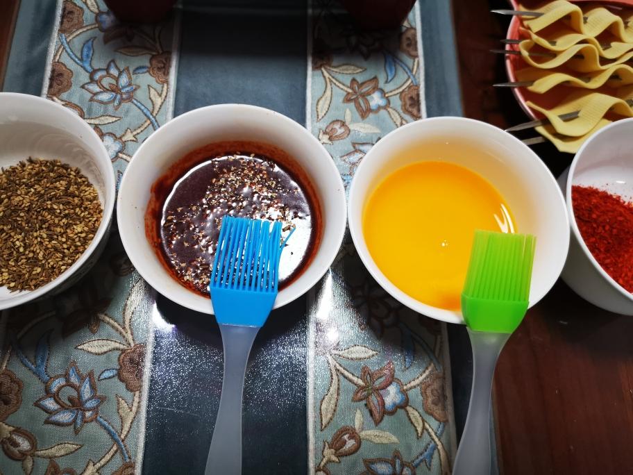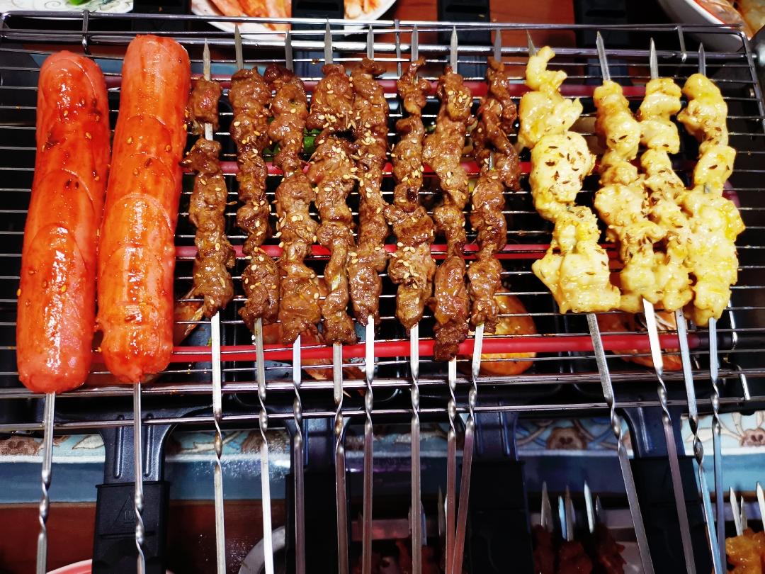 两面刷油,熟了肉串撒上孜然,芝麻,喜欢吃辣放点辣椒面,火腿肠刷上调的韩国辣椒酱
