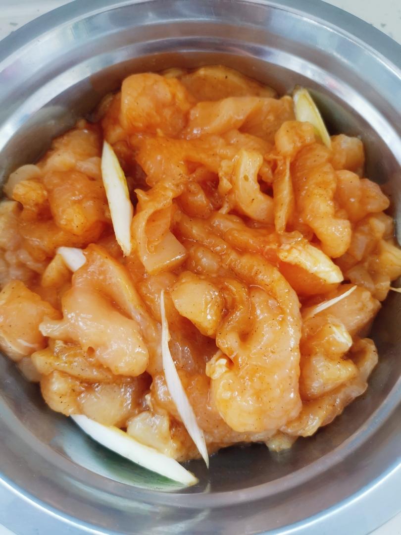 鸡胸肉切片,放料酒,葱(圆葱也可以)盐,黑胡椒粉,孜然粉,喂两个小时,然后穿串