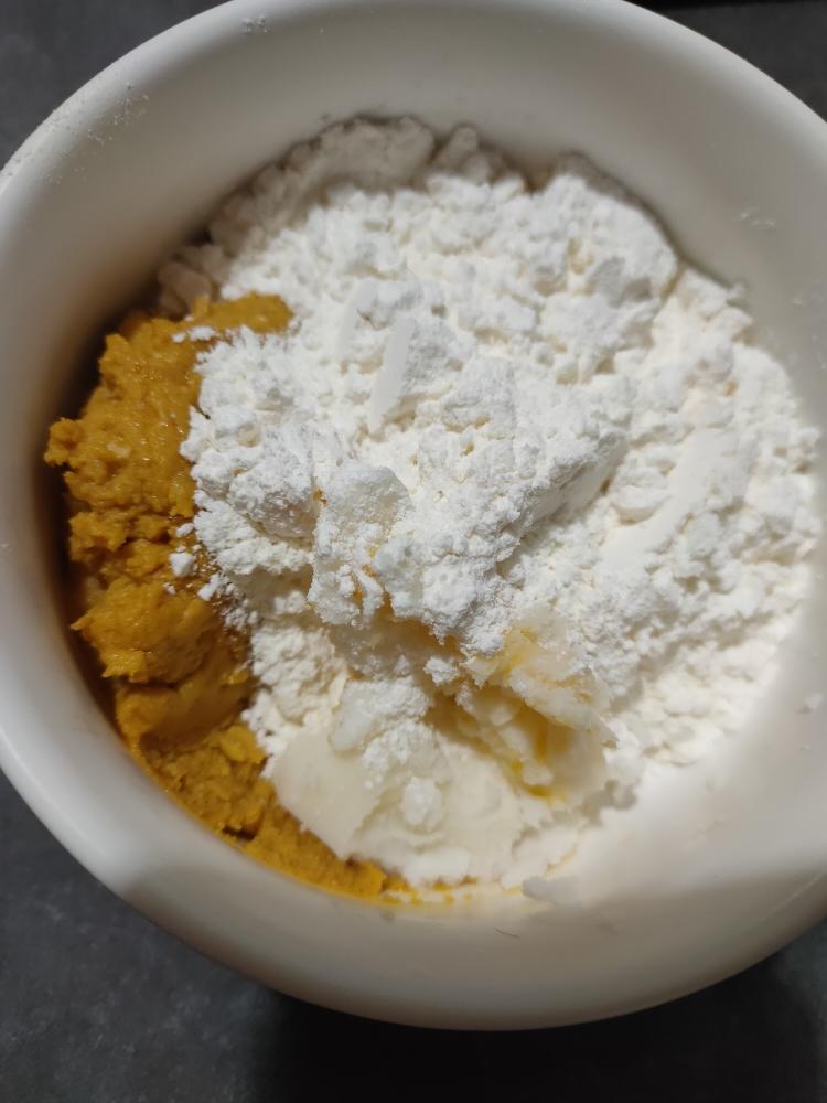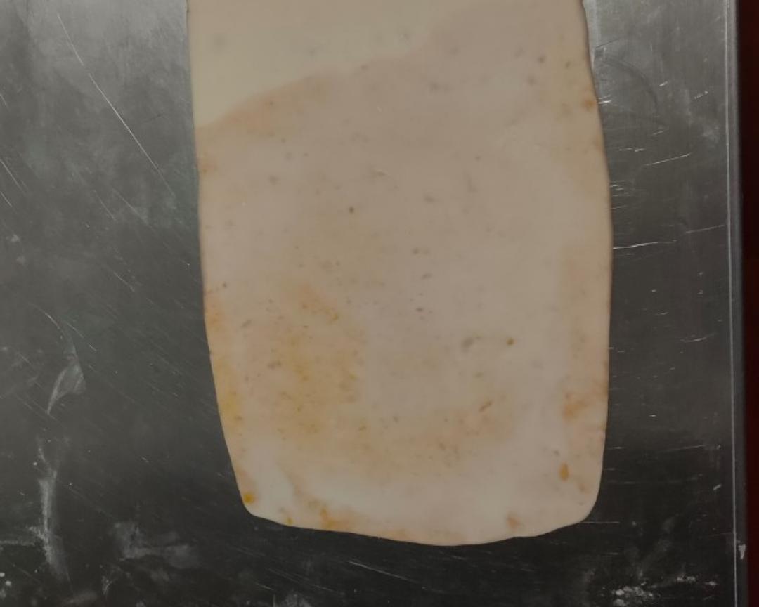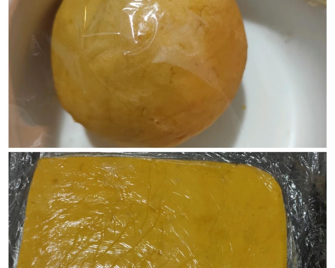 将蛋黄碎+低粉+猪油三者混合均匀成团,装保鲜膜擀长方形备用!再强调下哦如果你用的是淡的蛋黄请记得加盐哦!