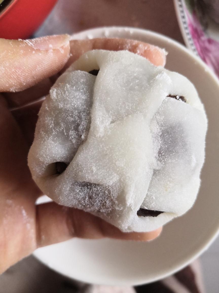 将皮分为25g-30g左右一份(普通的草莓25g就可以了,稍大一点的需要30g),沾取手粉擀开约手掌大小(本人懒了一下,没擀直接用手压拽的,所以皮薄厚有点不太匀,注重美美观的,外皮一定要擀匀),从草莓顶部如图中所示向下裹,捏紧整形。