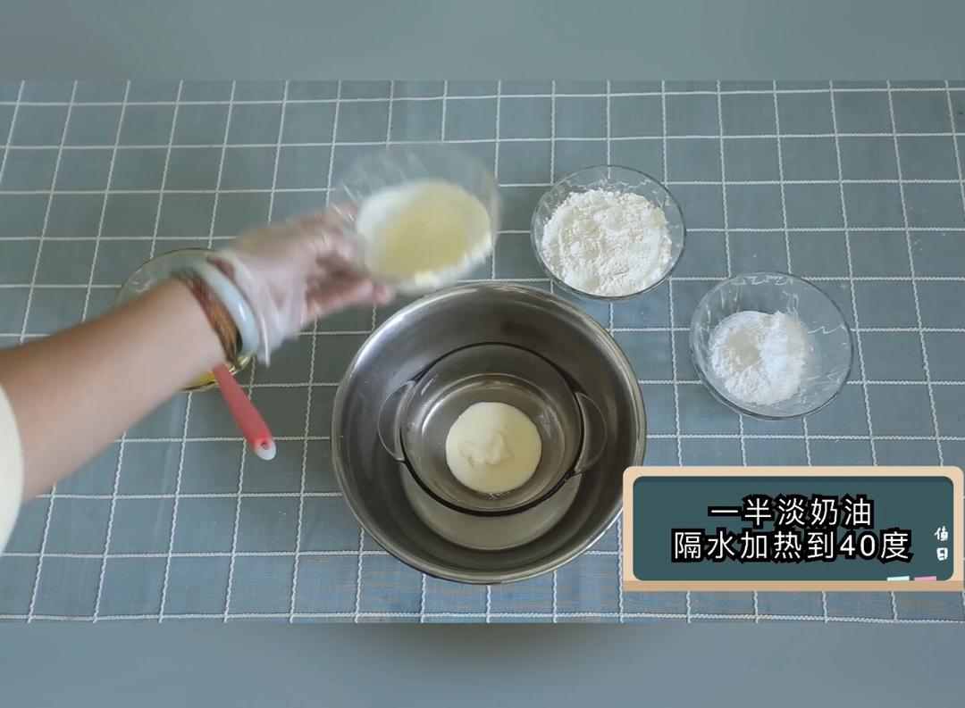 将一半淡奶油隔水加热到40度左右