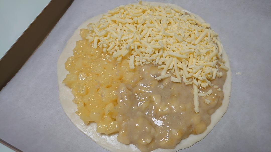 烤盘底部铺油纸,把香蕉泥和苹果馅对半铺在饼底上,上面再盖一层芝士碎 (这一步不放芝士碎也可以,我个人感觉芝士对味道的影响其实不是很大)