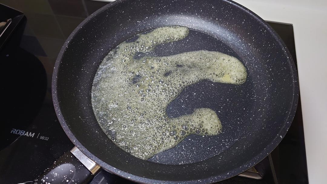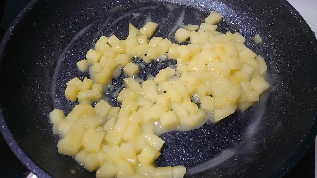 苹果切丁,小火把黄油化开 (没有黄油的话也可以用普通植物油代替,只是没有黄油的奶香味,影响不是很大)