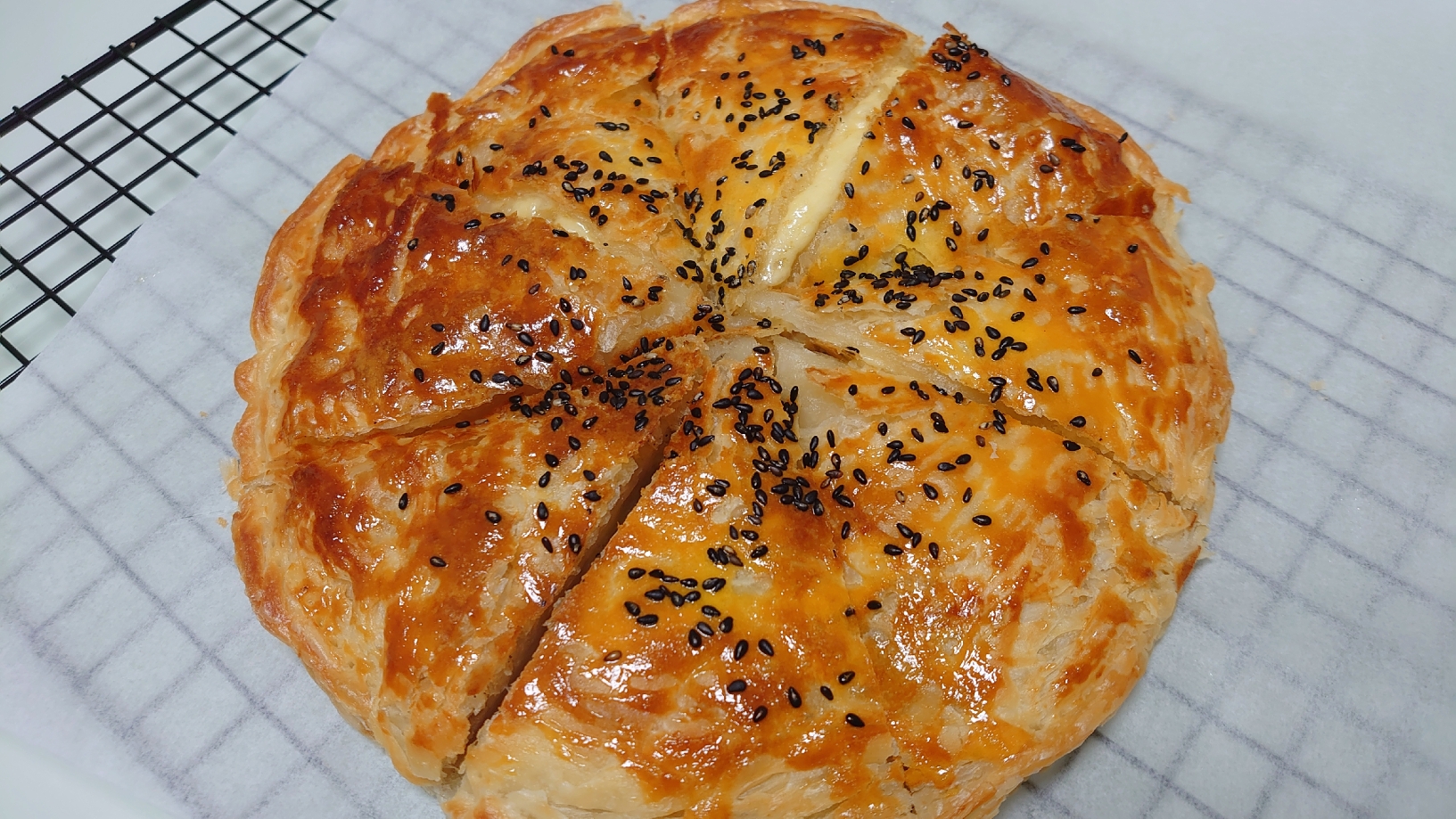 盖上另一片手抓饼,可以用叉子围着压一圈(照片上是用扎的,成品还是会有点涨开,但不影响味道) 最后在表面刷上蛋黄液(注意是蛋黄液,不是全蛋液),撒上黑芝麻