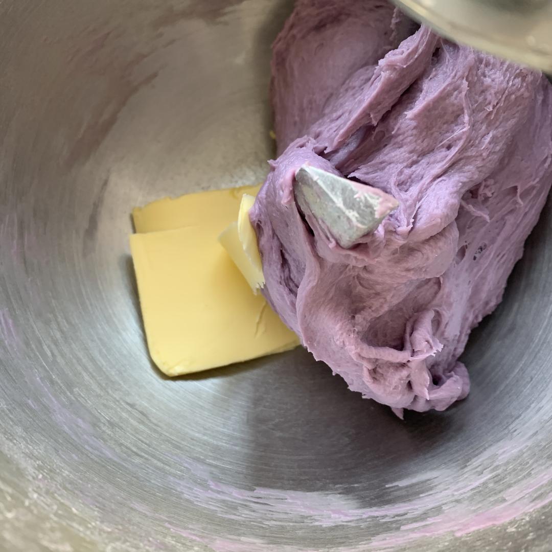把除黄油外所有的材料加入面缸,水2为预留水,面粉吸水性不同,不要一次性加入。打开机器,边搅拌边倒入预留的水。 打出粗膜后加入黄油,不用软化,直接切片,让面团稍稍降温。