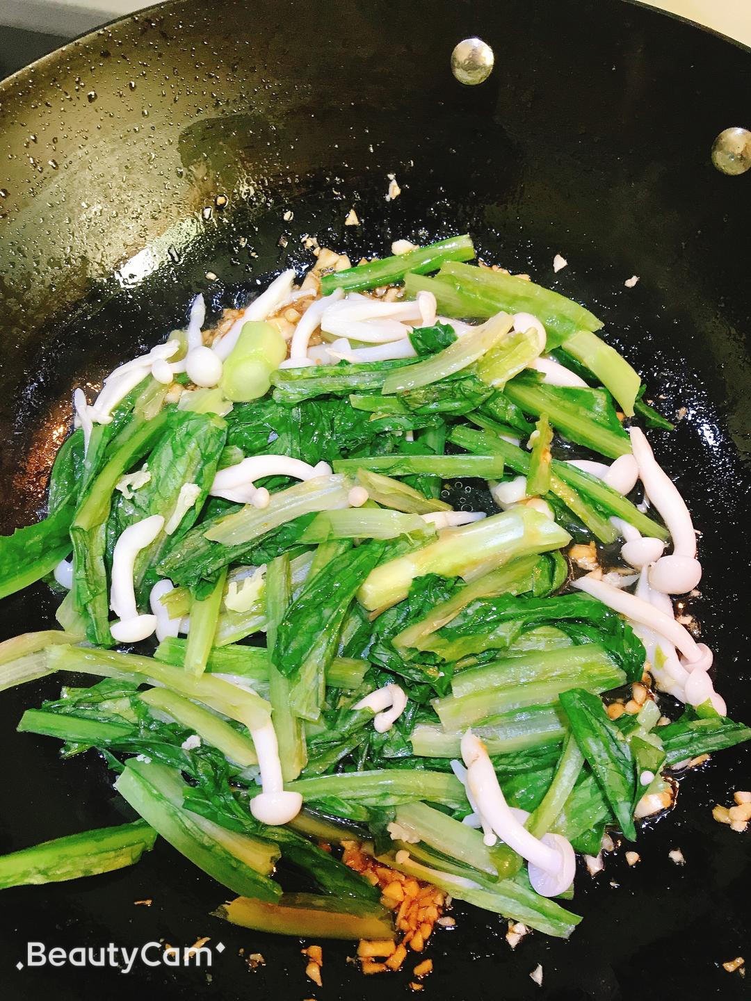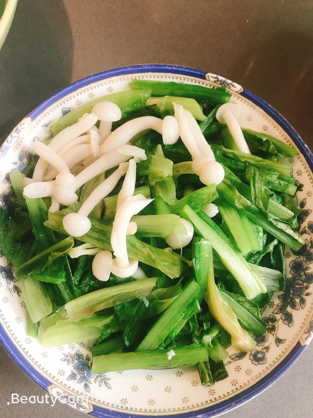 海鲜菇要炒熟,油麦菜今天我也用开水烫了一下 因为!洗的时候发现了一个大虫子,吓死,担心会有虫卵,烫了一下,马上捞出
