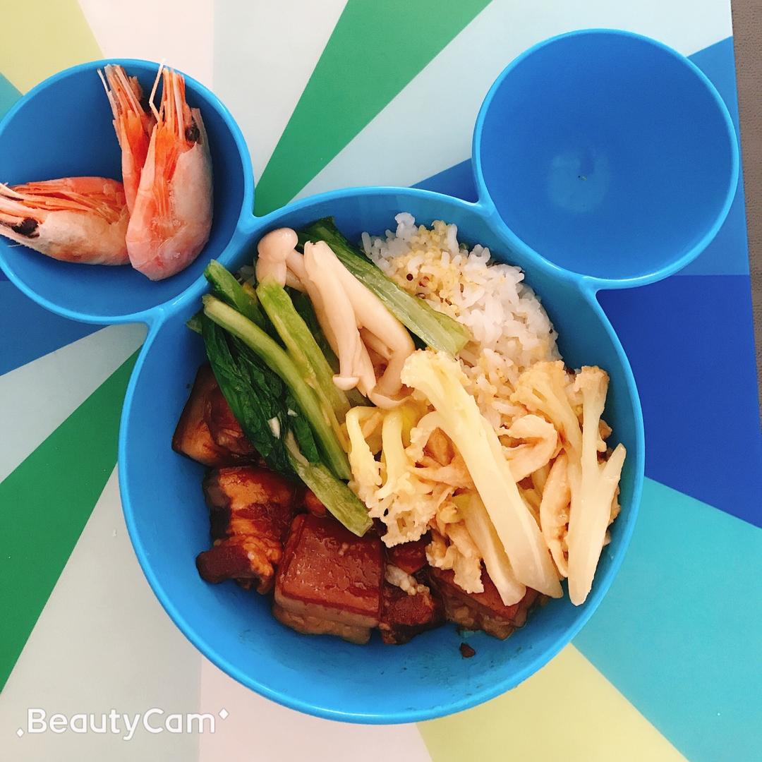 哥哥的搭配,杂粮饭,菜花鸡肉肉,油麦菜海鲜菇,还有红烧肉肉,北极甜虾三只