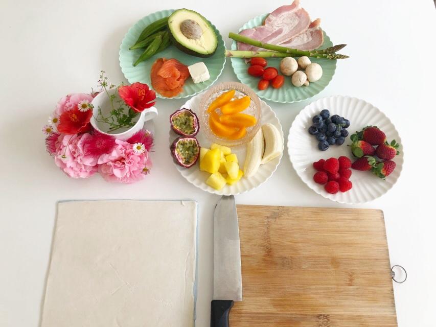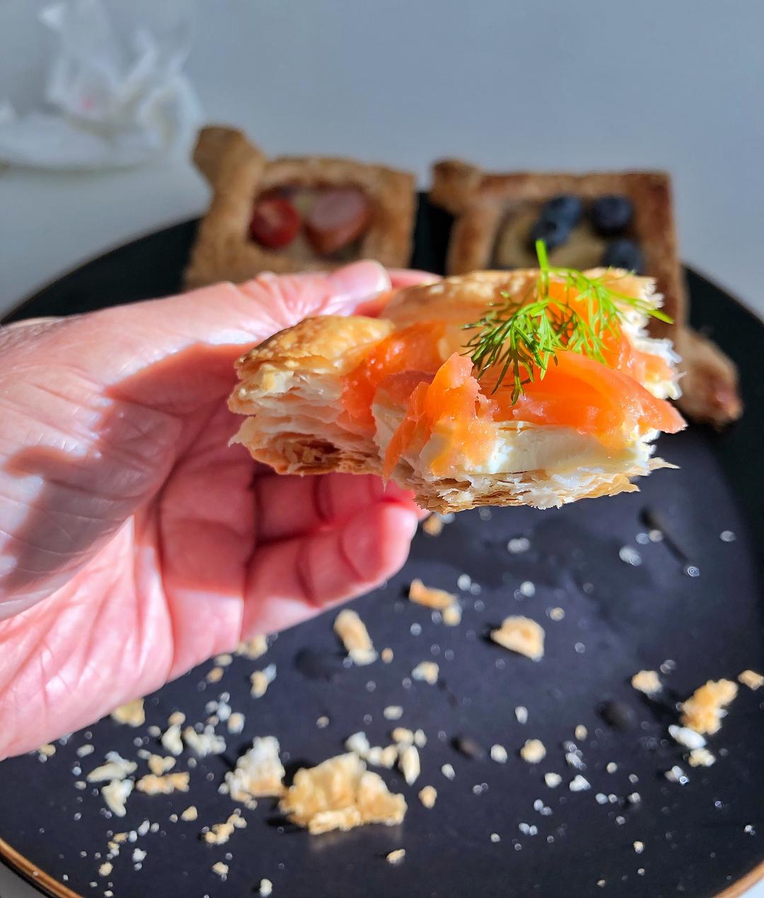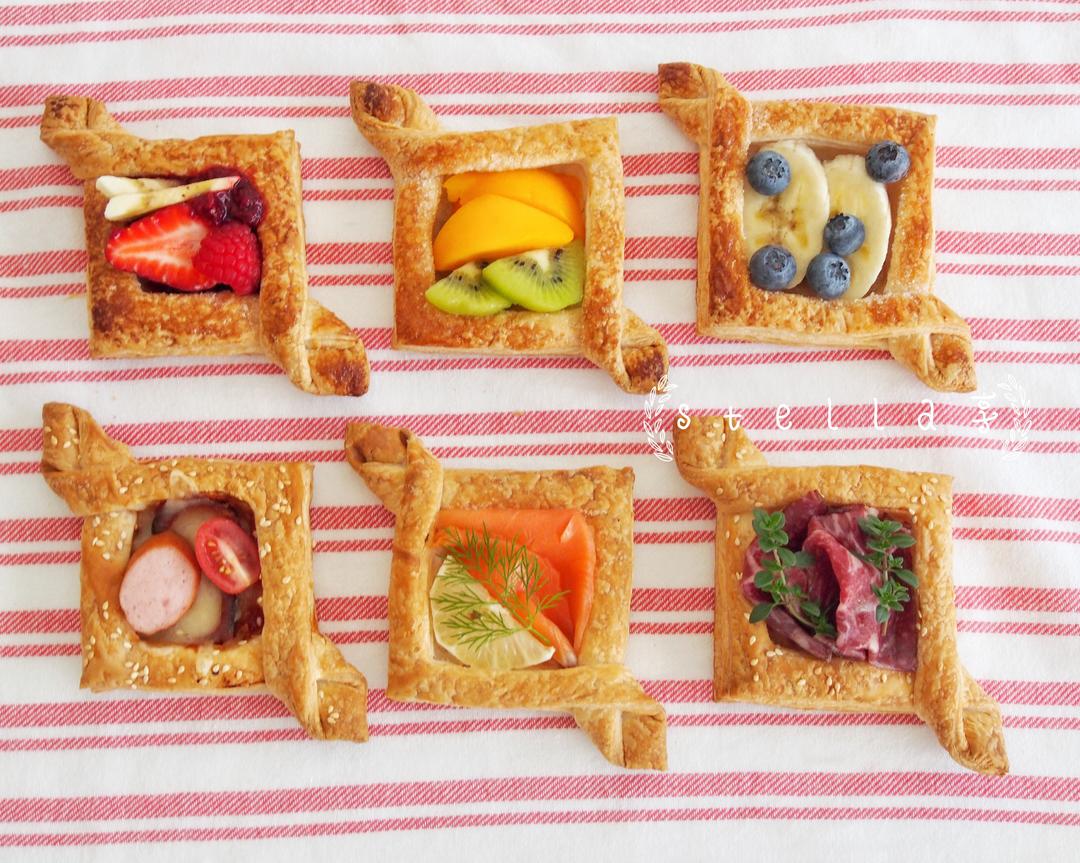放入预热完毕的烤箱烤制,25分钟左右。具体看酥皮的膨胀和上色程度,如果没到状态可以烤一会再拿出。取出后装盘,上面可以再点缀新鲜莓果和香蕉(直接放置冷冻莓果的朋友可以撒一些蜂蜜或者炼乳),还可以装饰食用鲜花。咸味酥皮派可以装饰切片后的牛油果撒一些现磨胡椒碎。