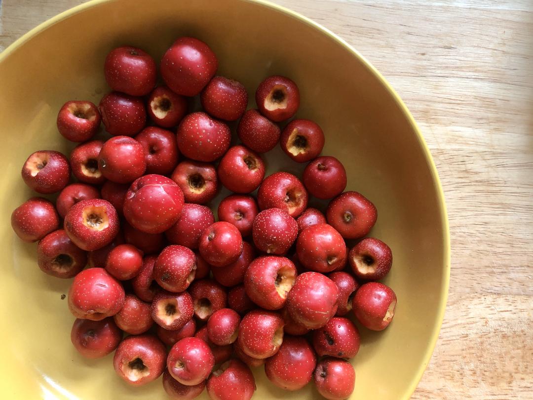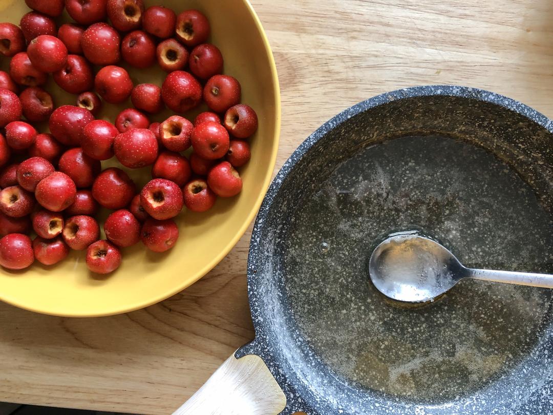 山楂洗净去掉脏脏的地方,我用的是野山楂,很小但是面面的更好吃哦,处理后晾干,可以用厨房纸吸吸水,看上去都是干的就好了(一点点水也没关系啦)