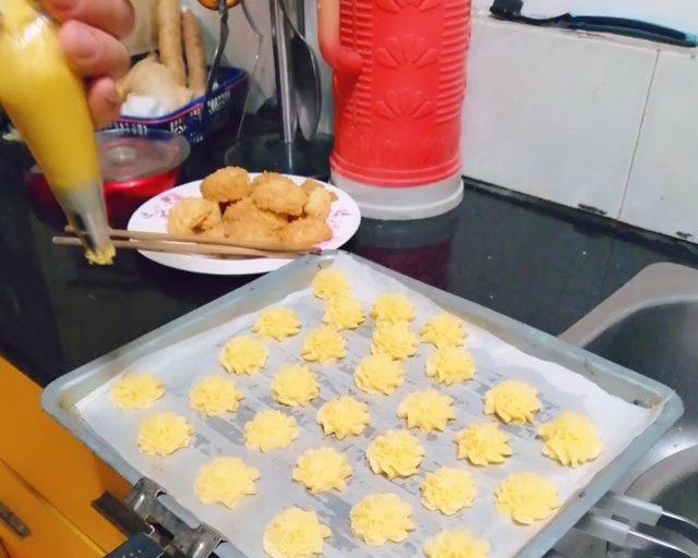 烤箱提前十分钟预热170度,放进烤盘后,温度控制在150度,烤制20到25分钟 美味的酥的掉渣的曲奇就完成了