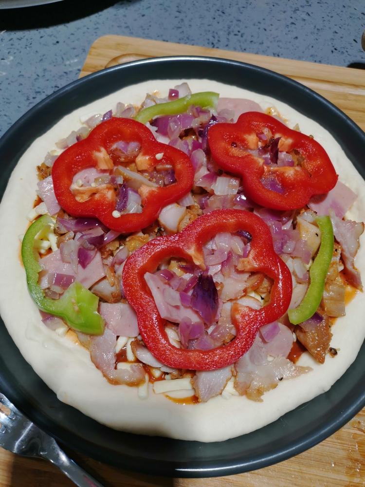 摆上好吃的鸡肉,培根,青红椒点缀,还可以放上蘑菇等等。