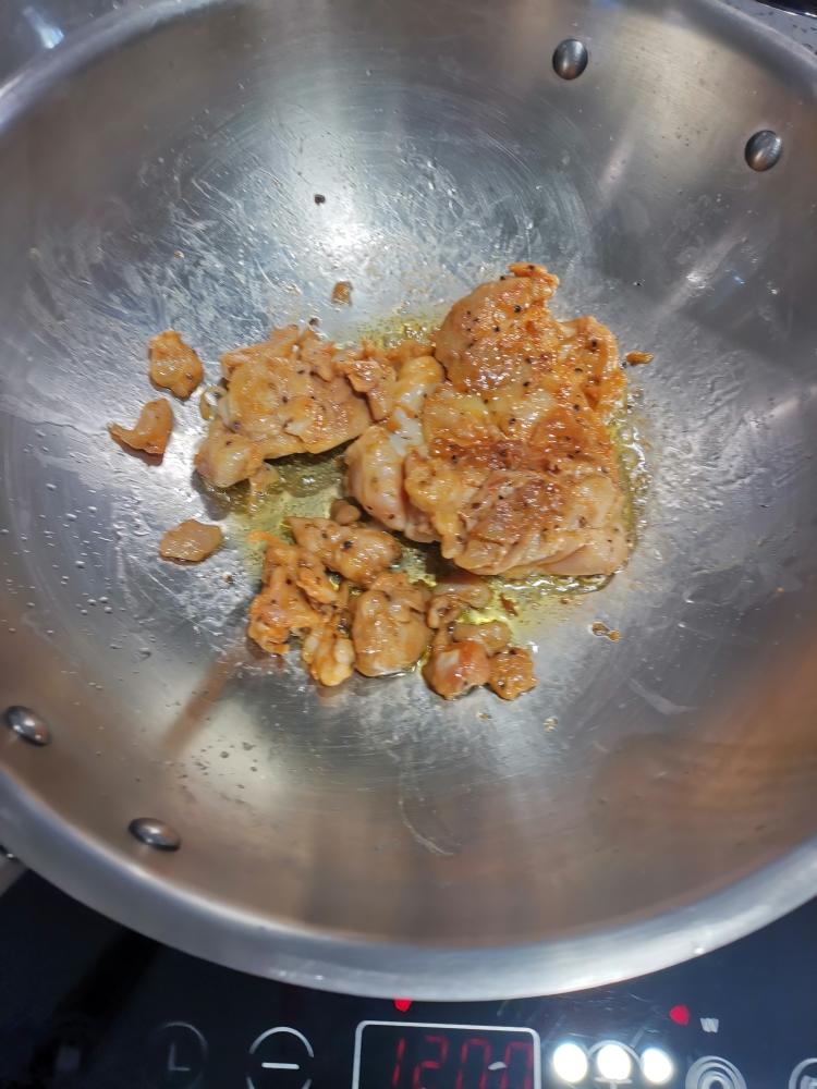 发酵面团的时候可以把去骨鸡腿肉用拉歌蒂尼不锈钢锅煎8分熟,鸡腿我是用cook100黑胡椒烤肉料提前腌制了一晚。