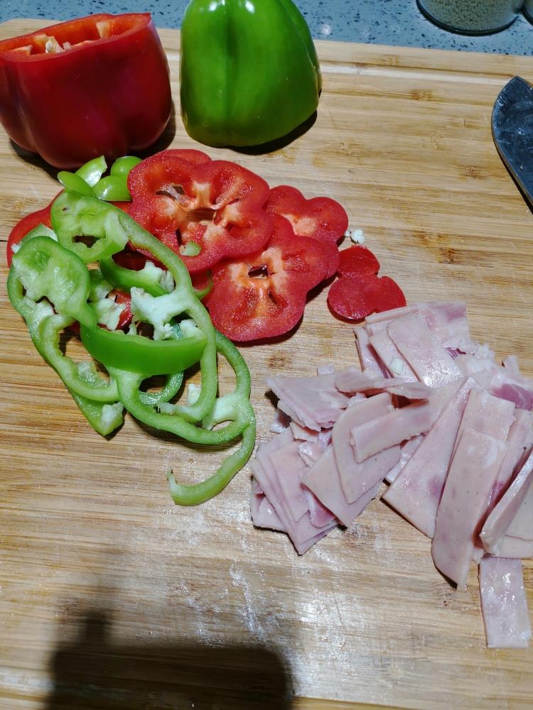 切点蔬菜,培根,火腿片,可以煎一下。
