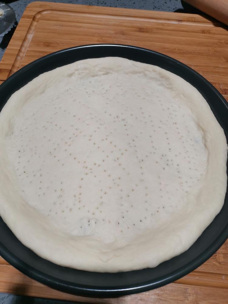 发酵好的面团取出排气,醒10分钟,擀成圆形面饼,边缘厚一点,放入8寸披萨盘整形,用叉子在面团上戳小孔。