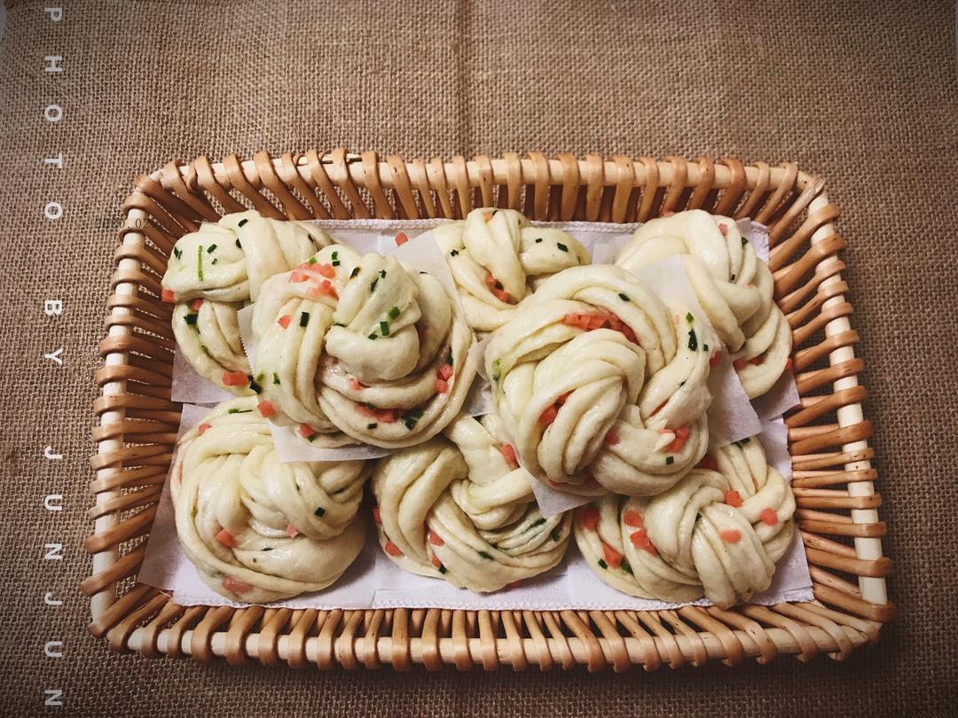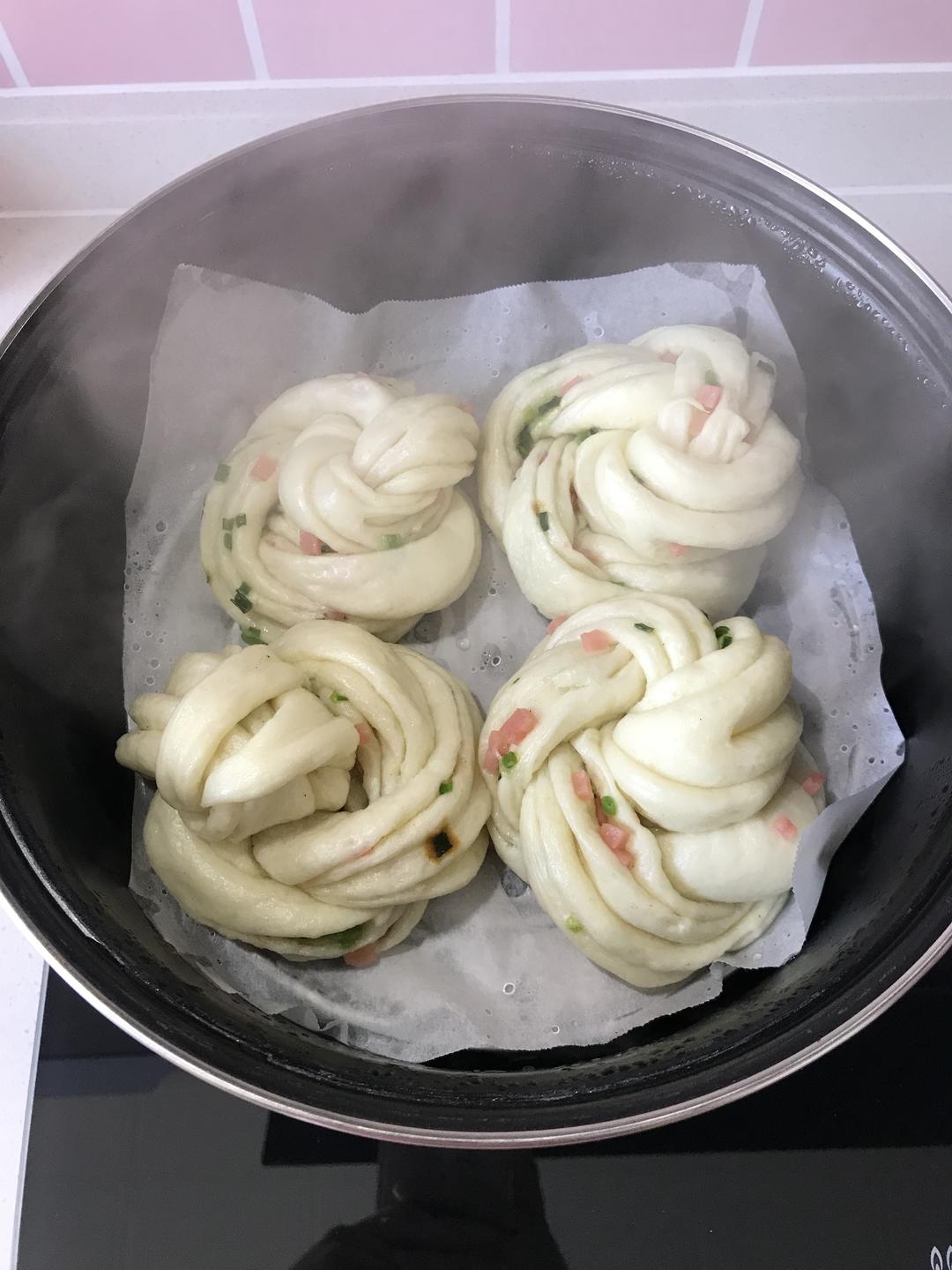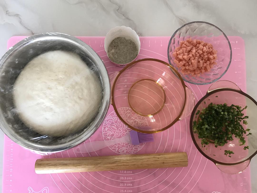 醒发的时候准备葱花,放点小苏打可以让葱花蒸好后颜色不变黄,放一点点翻拌均匀,千万不要放多了。火腿丁切小一点。