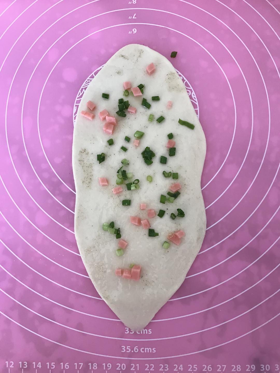 取其中一段,擀面棒擀成长长的,像这样,刷上一层油,撒上盐,葱花,火腿丁。
