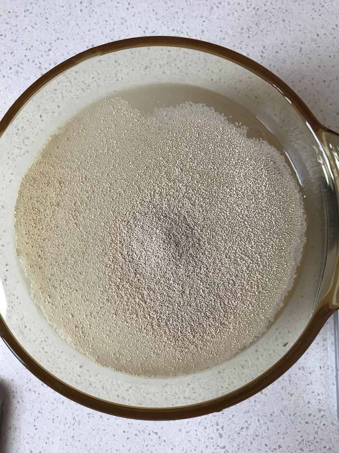 到260克温水,放入5克酵母,放入20克糖搅拌均匀。